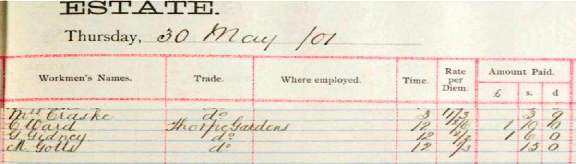 Nick says ”He is recorded as receiving 15 shillings (20 shillings made 1 pound sterling) for two weeks' work at Thorpe Gardens (I don't know exactly where this would have been on the estate). At this date he would have been 15.”