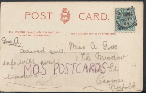 Postcard from L Gotts in Bristol to Miss A Gotts in Cromer Oct 1904