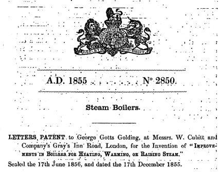 Lettice and James Golding had several children, one of whom was George Gotts Golding. He worked for W Cubitt & Co, as an engineer, and in 1856 he had a patent granted for a new type of steam boiler.