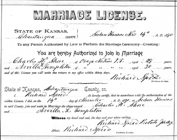 They married by licence in Sedan, Kansas, just over the border north of Bartlesville. This shows they are living in the Osage Nation in Indian Territory. It seems a long way to go to be married. We don’t know yet if Charles was also a Quaker. She married under her maiden name, which suggests she did not marry Henry Gotts, but lived with him.