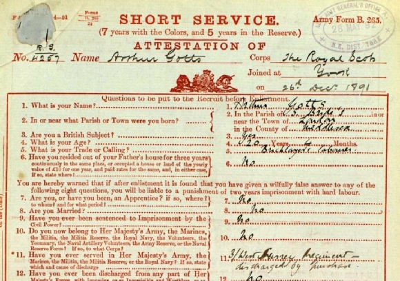 It turns out he had served in the East Surrey Regiment, attesting in May 1888 at Kingston, but his name is actually Henry Jordan, not Arthur Gotts. He stated his mother was Emily Jordan of Brixton, London, though he had not declared anyone as next of kin when joining the Royal Scots.