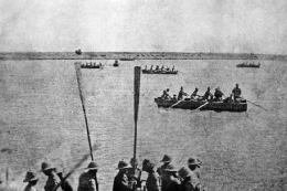 To do this they built boat bridges using canoes. Bertie commanded a pontoon boat during the battle of Shumran bend on February 23rd 1917 and ferried 12 loads of soldiers across under fire.
