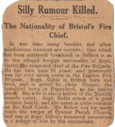 In wartime many baseless and often mischievous rumours are current. One which has been scattered broadcast in Bristol is the alleged foreign nationality of Supt. Gotts, the respected chief of the Fire Brigade. He has been here for 28 years, and previously seven years in the London Fire Brigade. Supt. Gotts is British born and bred, and is proud to claim Cromer, the beautiful town in Poppyland, as his native place.