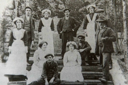 (Standing l to r): FLO WOODHOUSE, parlourmaid; Mr GOTTS, gardener; LILY WOODHOUSE, parlourmaid; ?;