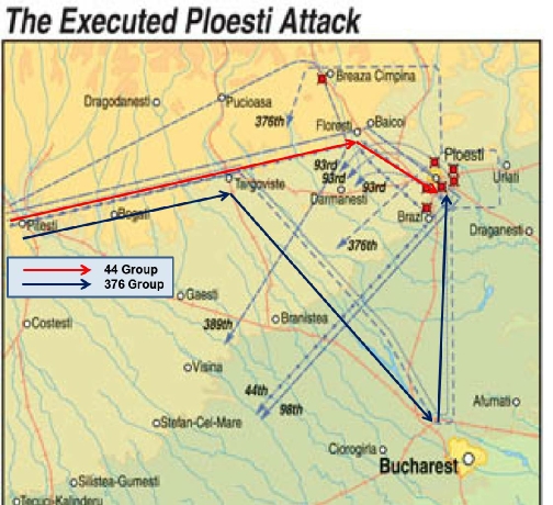 - Pitesti (at left of map) was the last assembly point where they turned east. At Targovisti (centre) Compton mistook it for Foresti (NW of Ploesti), turned South East and ignored radio calls from his other pilots. After realising where he was they turned north, ran into heavy flak, and ended up attacking the wrong targets so that they were burning an hour before the scheduled bombers arrived.