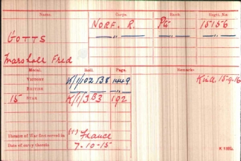 His Medal roll card shows he went to France 7 Oct 1915 and was killed in action on 15 Sep 1916.