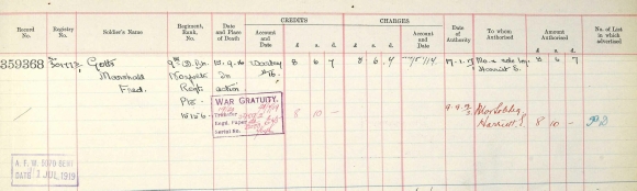 His Soldiers’ Effects entry gives a little more information, but only that it is paid to his mother Harriett rather than his father James.