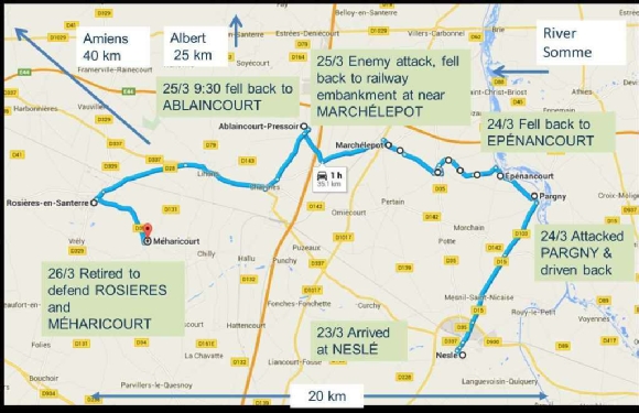 Maxwell died on 25 March, so somewhere in the retreat from Epenancourt to Marchelepot is the most likely. His grave says he died near this spot, though we don’t know how close that might be.