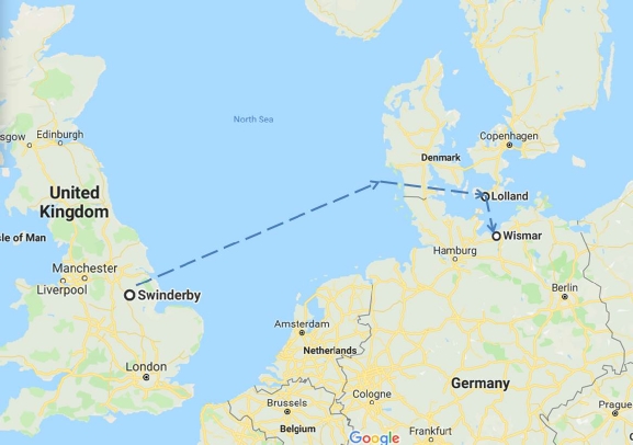 He was flying out of RAF Swinderby in Lincolnshire to bomb Wismar in Germany, and must have been following a route like this. Whether they were shot down on the way in or after the raid we don’t know.
