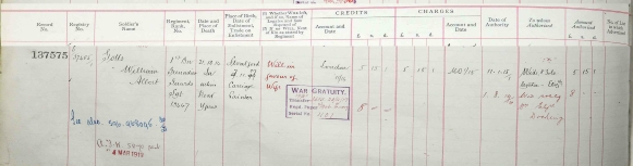 In the Soldiers Effects there are two accounts for him. The first lists him as Killed in Action near Ypres on 21 Oct 1914 and £5/15/1d was paid to her in January 1915.